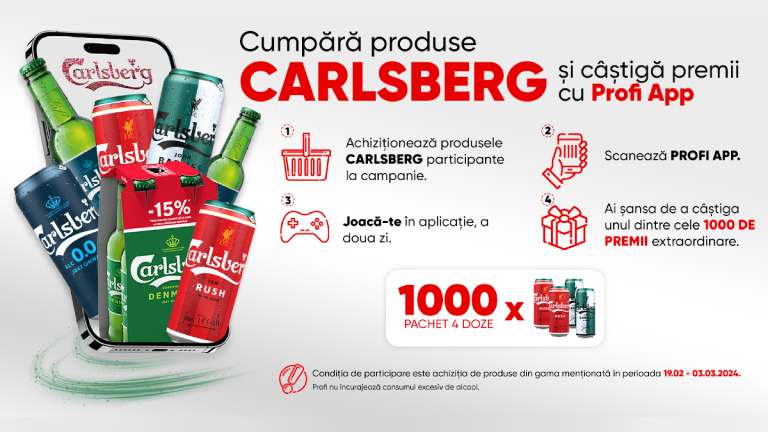 Achiziționează produse din gama Carlsberg, în perioada 19.02-03.03.2024 și vei primi o invitiatie pentru un joc special în aplicație! ? În decurs de 1-2 zile lucrătoare de la achiziția produselor participante la campanie, vei putea experimenta un joc exclusiv la care poți câștiga unul din cele 1000 de premii extraordinare!