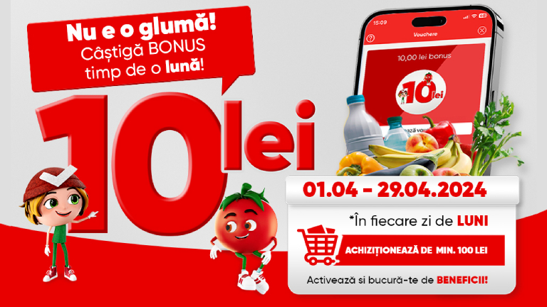 Bifa și Toma te invită să îți începi fiecare săptămâna din luna aprilie cu un BONUS special! ? Activează voucher-ul în Profi App, achiziționează de minimum 100 de lei și primești garantat 10 lei! ? Te așteptăm la cumpărături în fiecare zi de Luni!