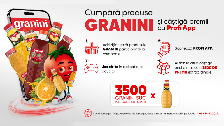 Achiziționează produse din gama GRANINI participante la campanie, în perioada 11-24.03.2024 și vei primi o invitiatie pentru un joc special în aplicație! În decurs de 1-2 zile lucrătoare de la achiziția produselor participante la campanie, vei putea experimenta un joc exclusiv la care poți câștiga un GRANINI, suc de portocale cu pulpa 1L!