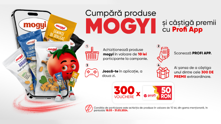 Achiziționează produse din gama MOGYI participante la campanie, în perioada 18-31.03.2024 de minimum 10 lei și vei primi o invitiatie pentru un joc special în aplicație! În decurs de 1-2 zile lucrătoare de la achiziția produselor participante la campanie, vei putea experimenta un joc exclusiv la care poți câștiga un VOUCHER de 50 RON!